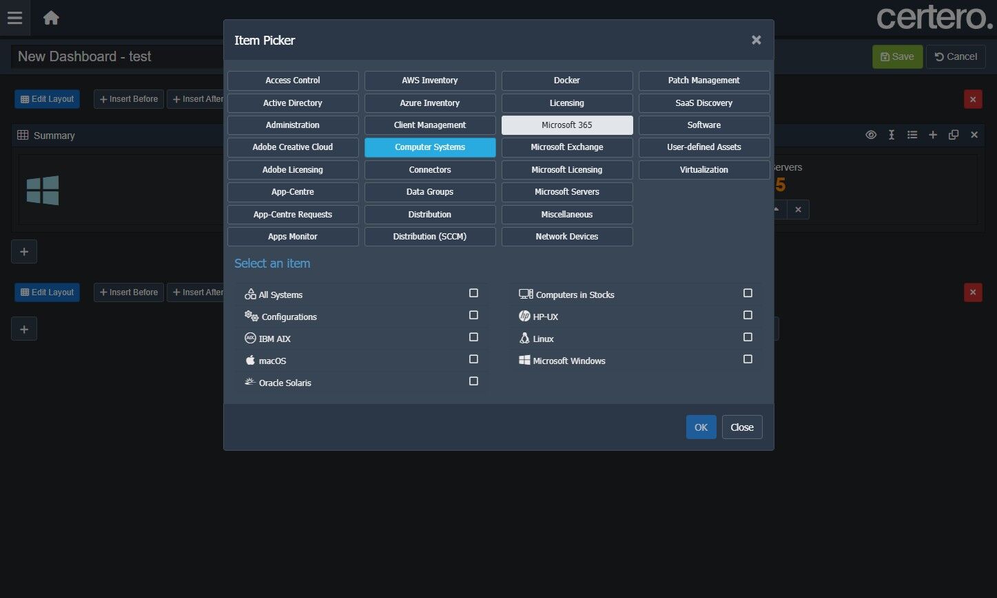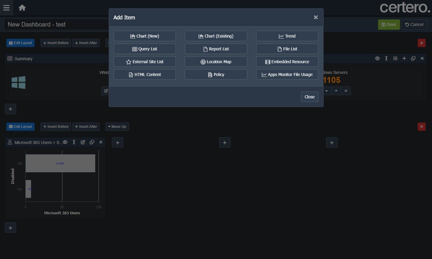 88. Click "Add Item Chart (New) Chart (Existing) Trend Query List Report List File List External Site List Location Map Embedded Resource HTML Content Poli..."