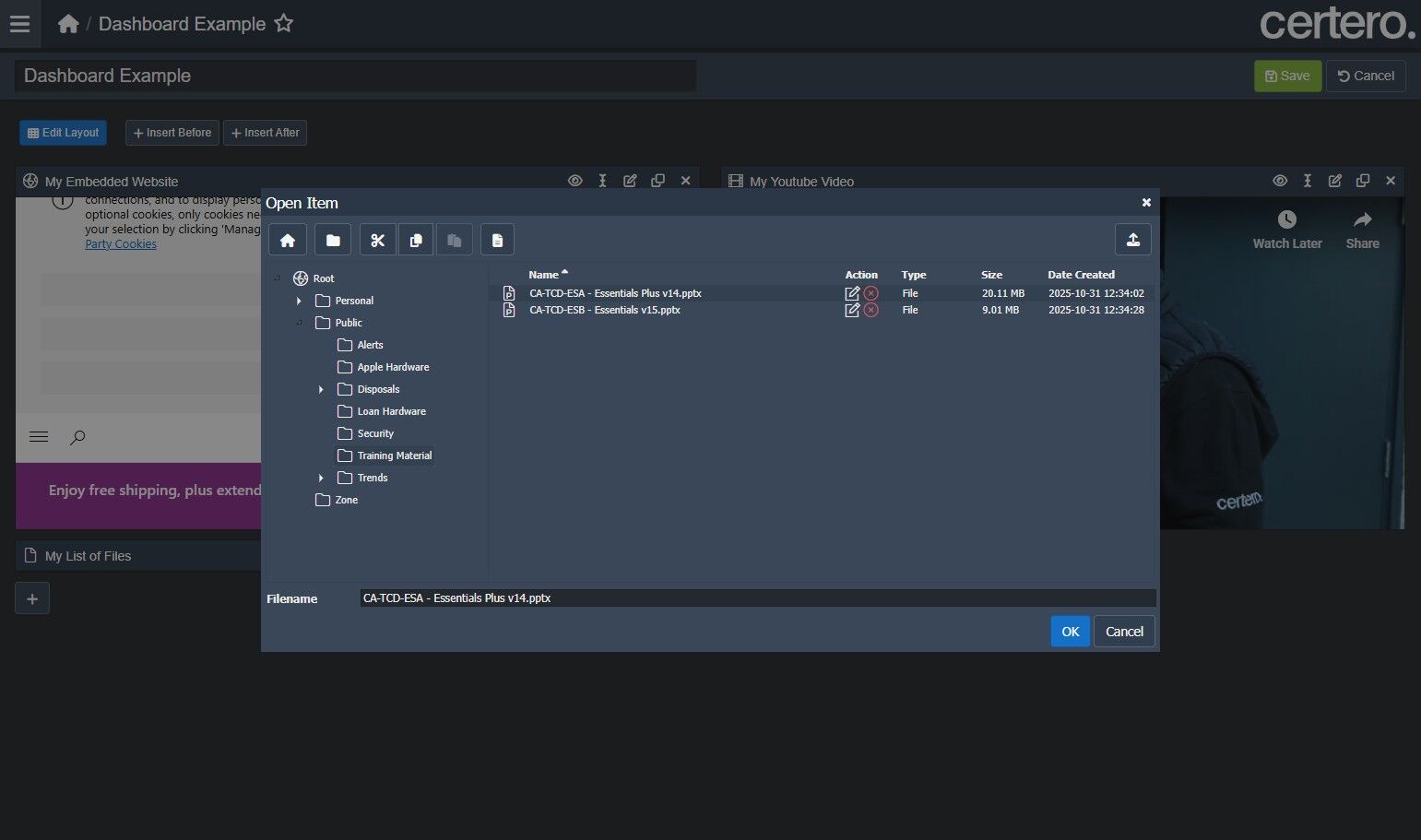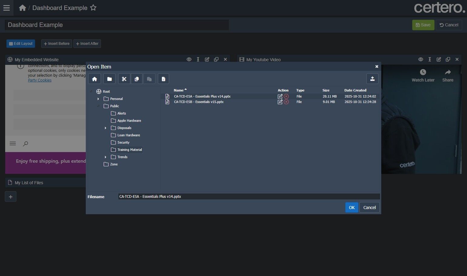7. Item Explorer in Certero will be displayed, navigate to the file you wish to include on a dashboard.