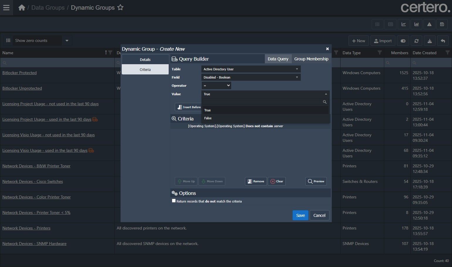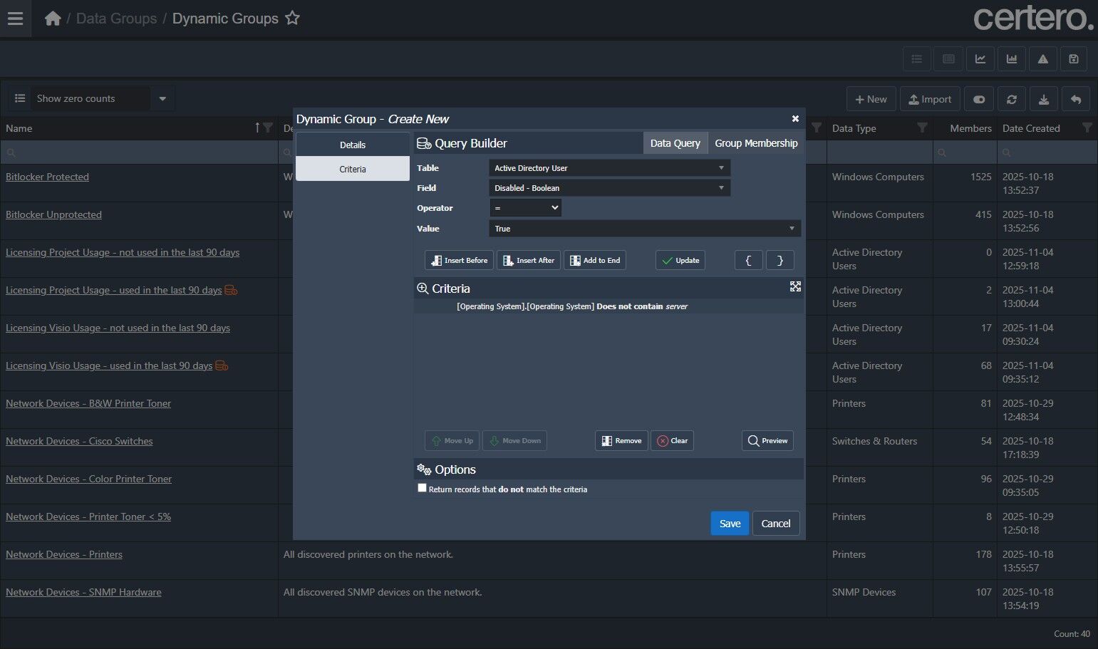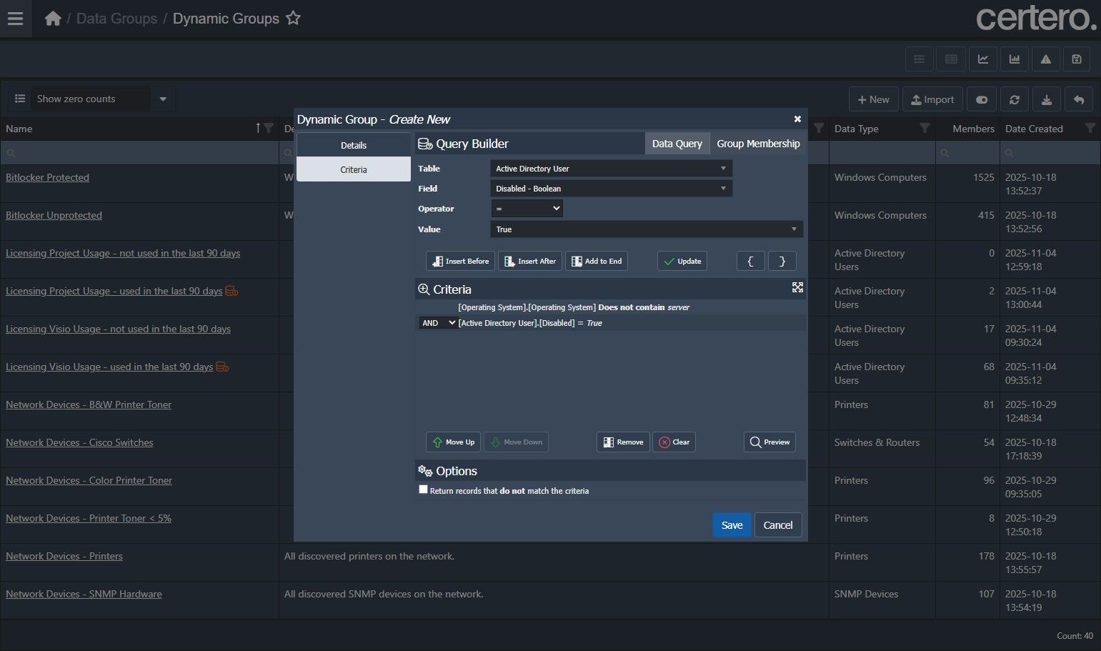 Use the example below to create a Dynamic Group in Certero to search, in this case, for active inventoried Windows Workstations where the last logged on user is disabled in Active Directory.