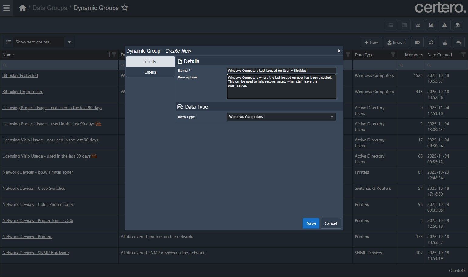 9. Type in a detailed description such as "Windows Computers where the last logged on user has been disabled. This can be used to help recover assets when staff leave the organisation.”